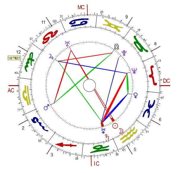 Colette’s chart lies on the Fixed Cross. She needed security, financially and emotionally, especially after her family had lost their home – a paradise to Colette – and she married Monsieur Willy, only to separate from him and fend for herself – a major achievement for a woman living at the turn of the century.