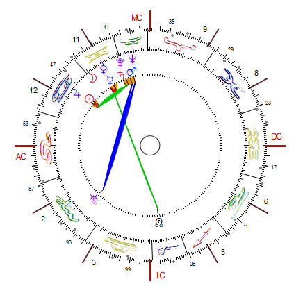 He would spend his life working conscientiously during the day and secretly at night when he could return to his Self – all those planets on the I-side – and write creatively about the unease of bureaucracy, rules and regulations. There is not sufficient blue in his chart and consequently he relaxed very little indeed. In the House chart, there is no blue at all, only exasperating red and green aspects.