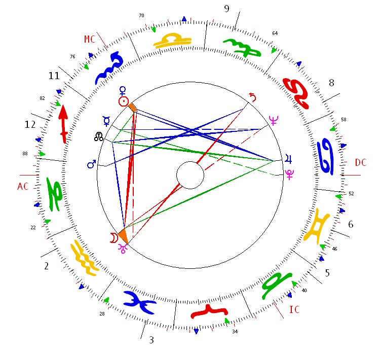 The chart is set up for the signing of the Armistice. The chart image is reminiscent of the zigzagging crossfire that took place across “No Man’s Land” on the battlefields and from the trenches. The chart shaping is predominantly Fixed – a lasting peace was hoped for but war again broke out in 1939 as the Age Point in this chart made an opposition to the Sun. The chart shows an emphasis on red/green aspects, indicating heightened sensitivity and awareness. Pluto is conjunct the descendant – the “You” side of the chart. This to me seems to symbolise the transition and transformation from the power, devastation and destruction of the war, but at the same time it also reminds me of the ultimate sacrifice made by so many in this truly appalling war. Pluto in Cancer is a reminder, too, that few families went untouched by the loss of loved ones, my own included. A whole generation of young men, and young women, too, who went to nurse at the Front, were lost or lost someone close to them.