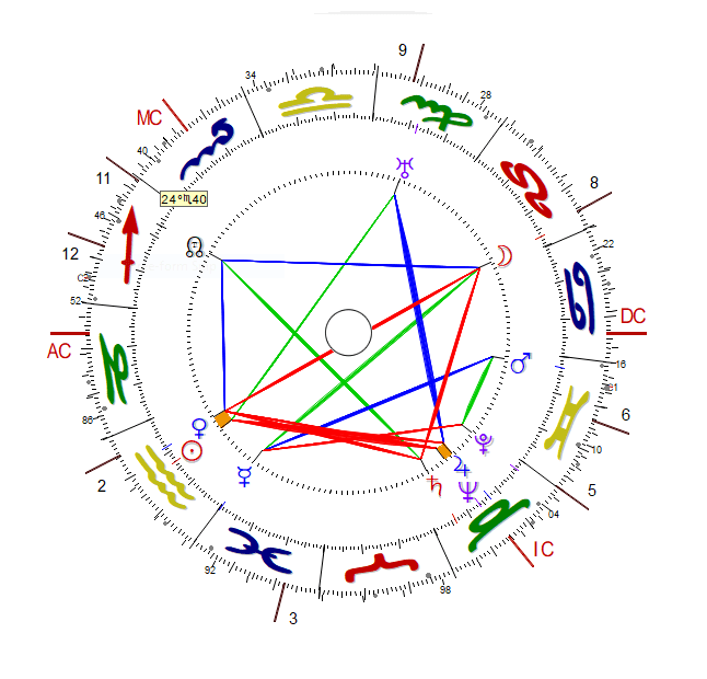 The opposition between the Sun/Venus and the Moon also affects the Dominant Triangle. His mental ego, fired up by Jupiter’s expansive and Neptune’s creative energy, longs for a breakthrough in the bigger picture of the 9th house where Uranus is in the stress zone, thus putting his innovative energy under constant pressure.