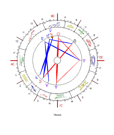 This opposition lies on the Possession Axis, both sides are in intercepted signs, but in the Radix and House Chart there are blue aspects to provide a way out for the Moon, for her emotional ego. It is her second strongest ego planet and it was constantly opposed by her North Node in the 8th house. She would have to take possession of her emotions – which the blue aspects enveloping the oppositions in the Righteousness Rectangle in her Radix enabled – if she wanted to remain on the right path for her soul.