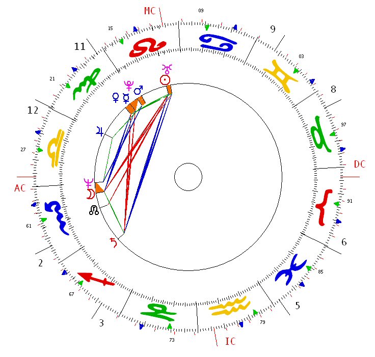 There are two interesting and relevant aspect patterns too. The blue/green Ear/Eye Information triangle is one of them. This figure picks up and stores information and messages of all kinds. The other is the Shield, a quadrangular figure. The Hubers say in Aspect Pattern Astrology that this figure is relatively rare and has high absorption power; appropriate then for the chart of the first signals received from space by the telescope.