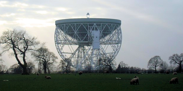 Featured image of the Jodrell Bank Radiotelescope by fitzyt via Wikimedia Commons.