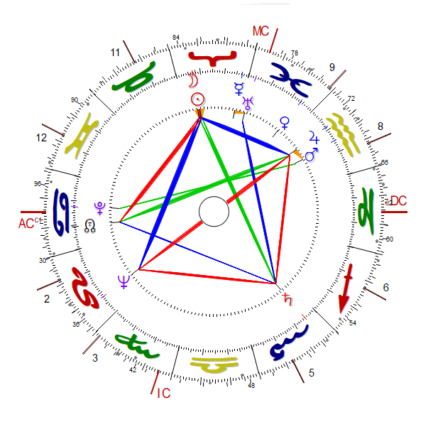 The Sun and the Moon, as well as Mercury, are in an intercepted Aries, but found outlets via aspects to several other planets, notably Saturn in the 5th house, in the valley. By going down, or in Hillman’s language “growing” down, we root ourselves in the world where me make soul. He often quotes John Keats who said: “The world is the vale of soul-making”, the ‘vales’ represent the depressions of the psyche.