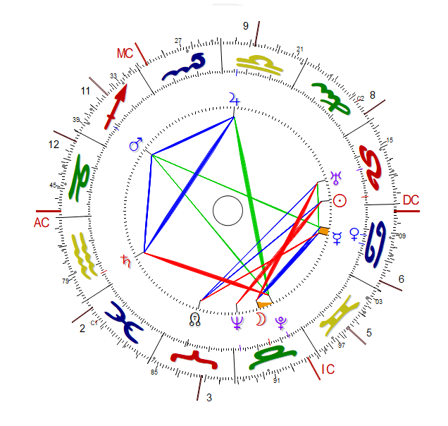 The Great Teacher – his strongest ego planet – is in an Aquarian first house. Of his parents, his mother played the stronger role. He could relate to her, from early childhood, as she seemed to have two personalities just as he did. In his autobiography, Memories, Dreams and Reflections, he states: “By day she was a loving mother, but at night she seemed uncanny. Then she was like one of those seers who at the same time is a strange animal (…). At such moments she was the embodiment of what I have called “the natural mind.”” And “She seemed to think along similar lines as myself.” Because she couldn’t confide in her husband, she often confided in her son, thus making him aware of something underlying what appears to be reality. She spent considerable time in her bedroom where she said that spirits visited her at night. But then, the Occult is just one of the life philosophies of Aquarius.