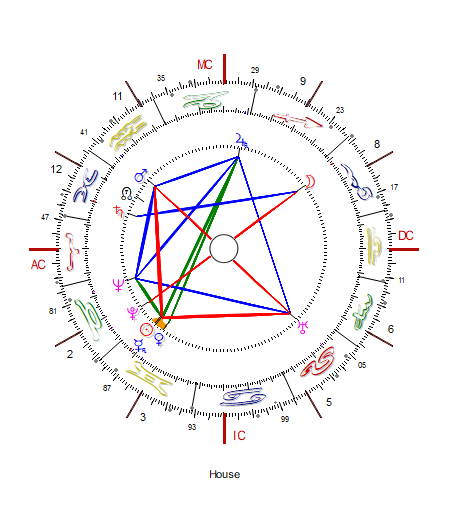 Fortunately there are many blue aspects in her House chart, which form  a Kite, with its tail in the 5th house and heading for the 11th house where her North Node points her in the right direction for her soul’s journey. Her life philosophy was that of dance and she wrote several books in this area.