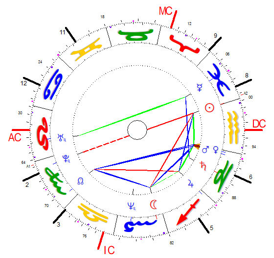 His chart is unusual in that it has two parallel linear aspects spanning the I/private side and the You/public side. One red, one green, they link both halves of the chart like zip wires suspended over a canyon, at the bottom of which, hidden, sits unaspected Neptune in the 4th house.